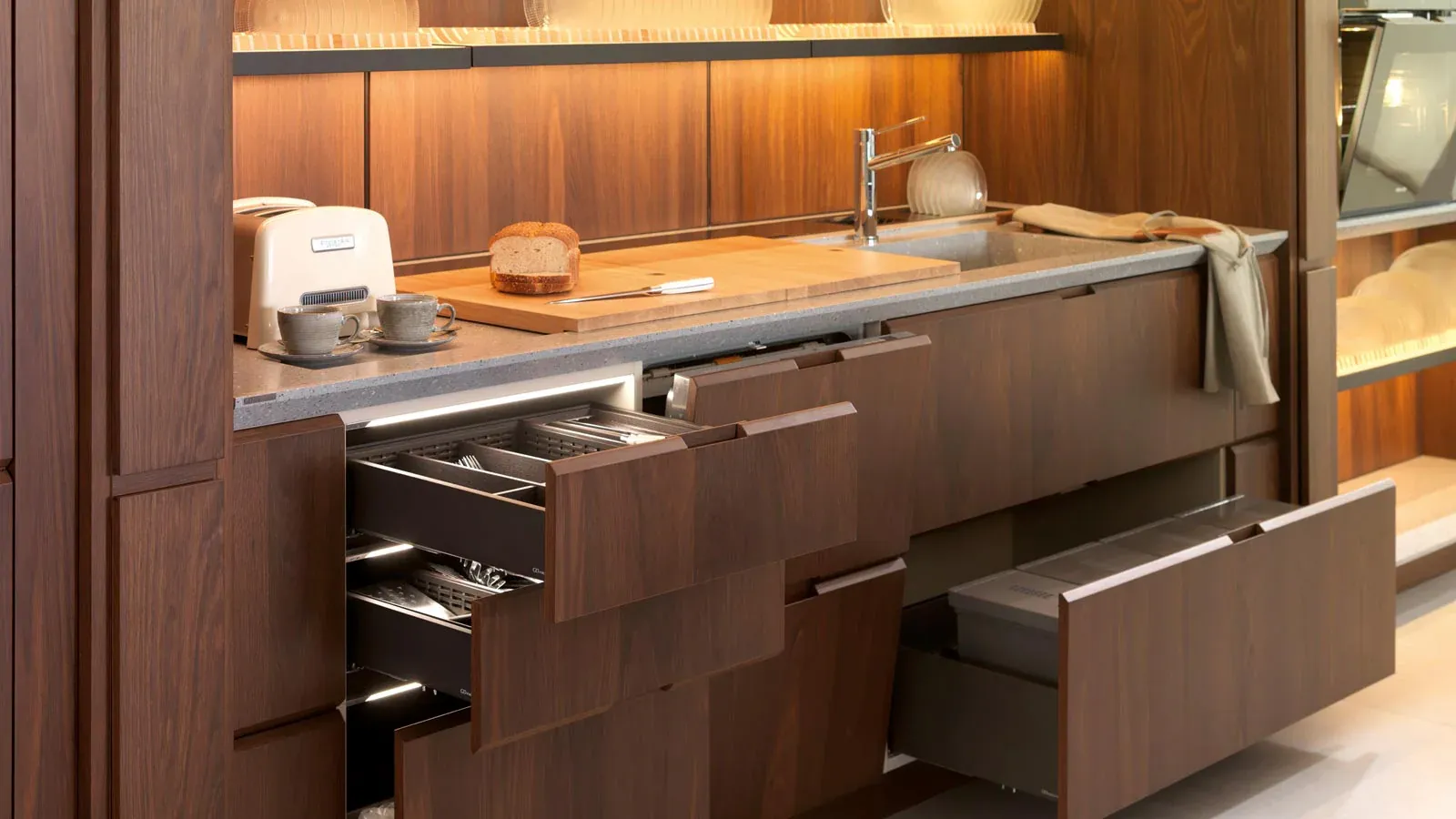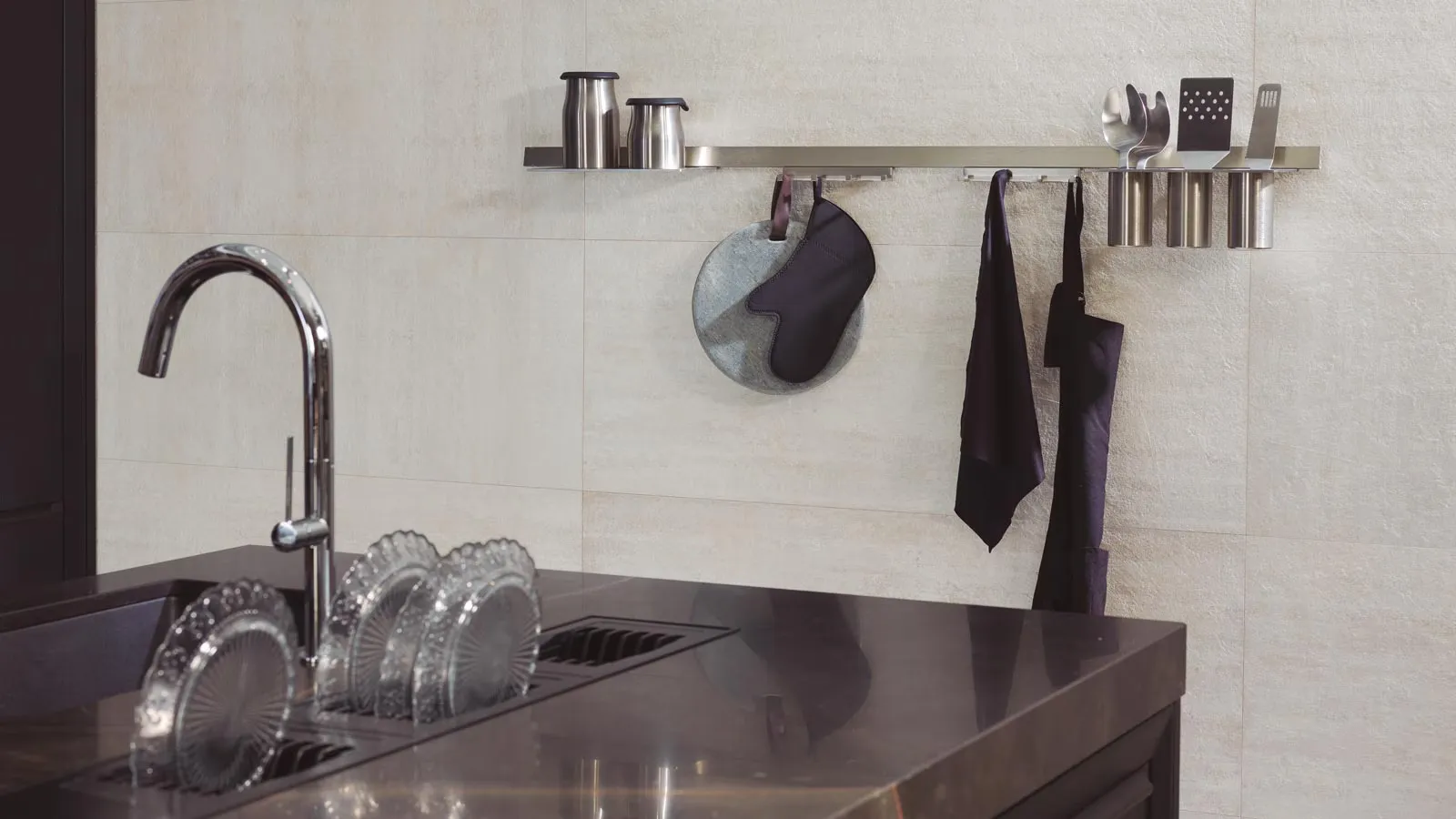 Très fins, les carreaux de porcelaine peuvent mesurer seulement 6 mm d’épaisseur, ils sont donc parfaits pour le revêtement de meubles de cuisine. Les raccords invisibles permettent de créer des surfaces continues donnant une impression de volume tridimensionnel. Les éviers, les crédences, les rebords, l’épaisseur du plan de travail, etc. peuvent tous être intégrés de manière harmonieuse.