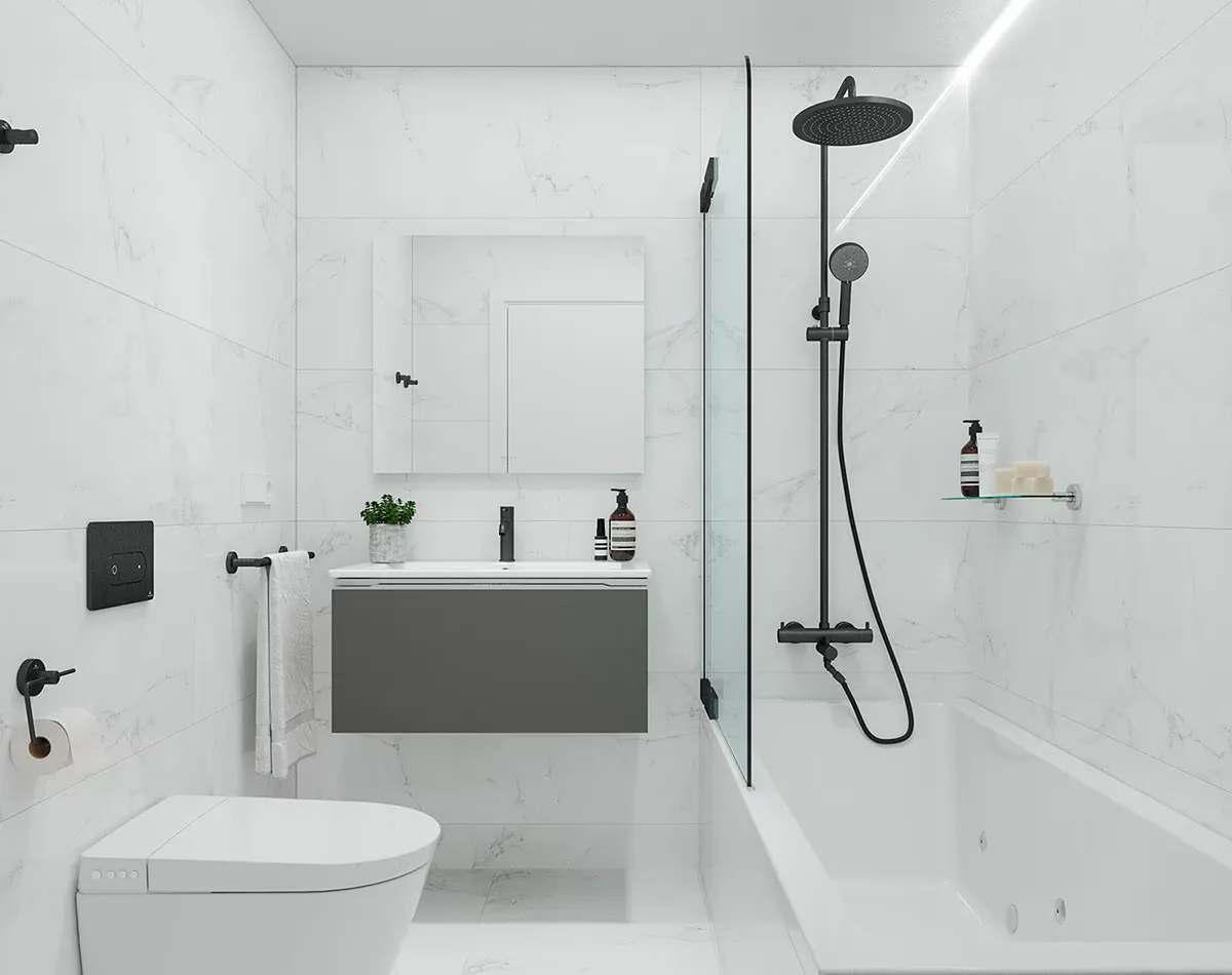 Produits : Marbre Carrara Blanco 45 x 120 / Poussoir Oval Black / Baignoire d’hydromassage Minimal XL 180 x 80 / Support papier toilette Hotels Black / Patère Hotels Black