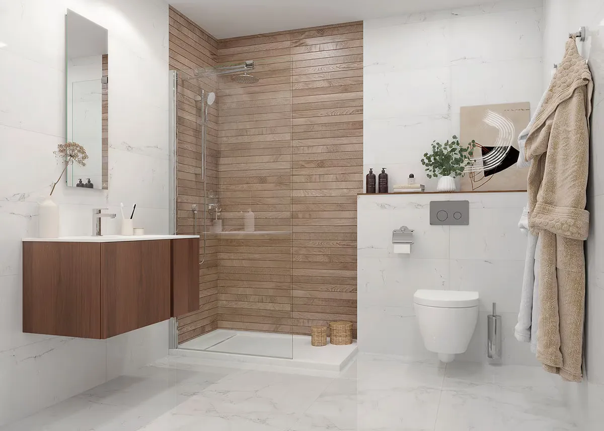 Produits : Nantes Caliza 45 x 120 / Mosaïque Nantes Caliza 45 x 120 / Mitigeur Lavabo Tono / Pack Douche Nk Cromo / Berna Topo 120 x 120