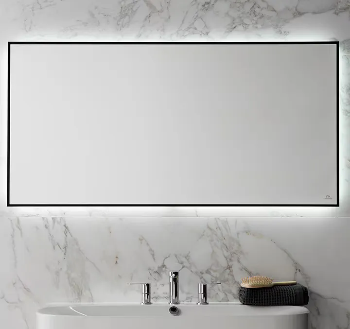 We recommend combining the LED illuminated mirrors with a neutral or lighter wall finish. The indirect lighting washes over the adjacent walls which reflect light back into the space and create a luminous effect.