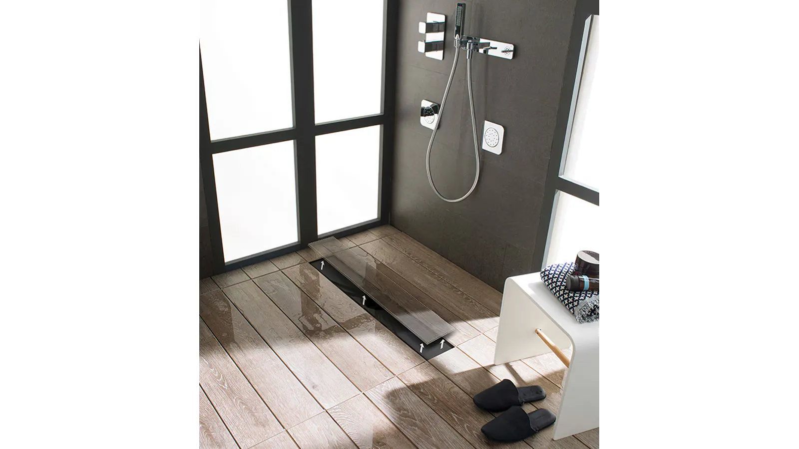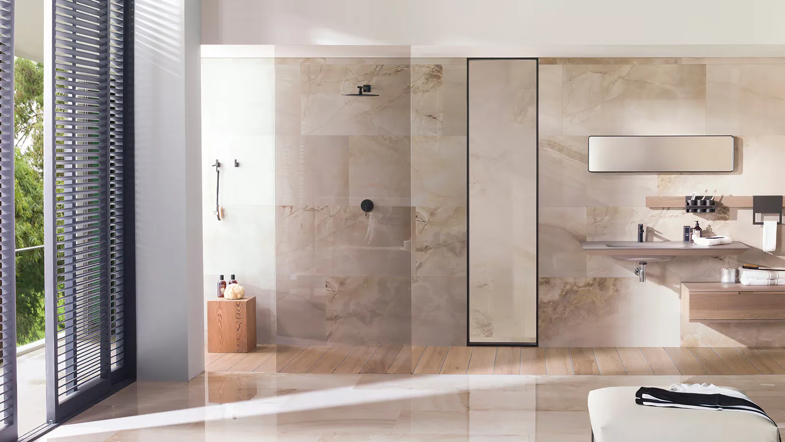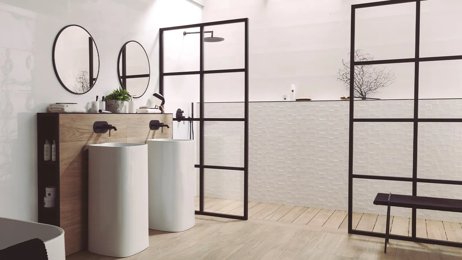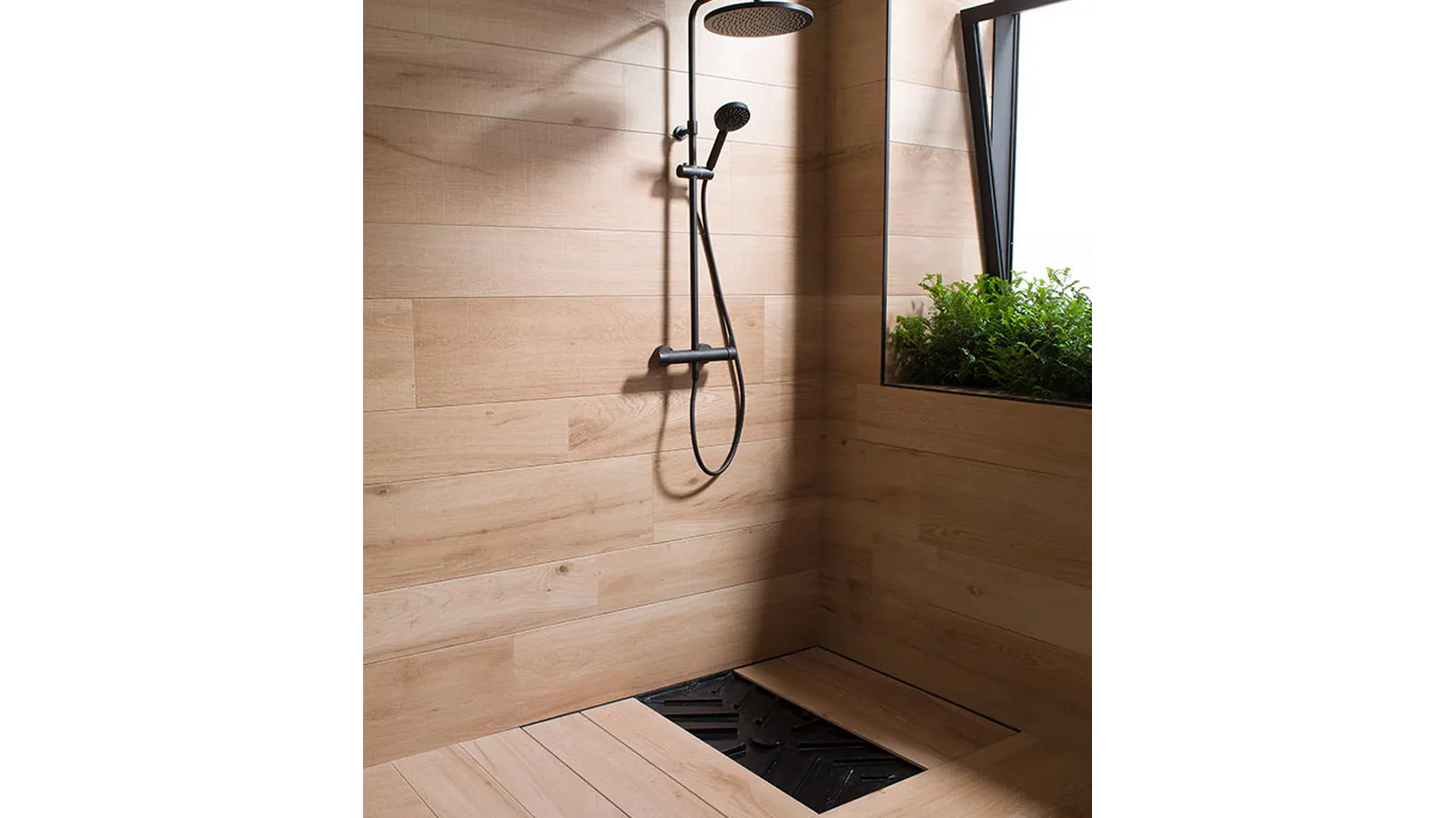 If you’d prefer to have your shower tray at floor level, Butech recommends their Shower Deck system. The technical shower solution hides the drainage, and stone or wood effect ceramic tiles such as PAR-KER and STON-KER by Porcelanosa can be installed over.