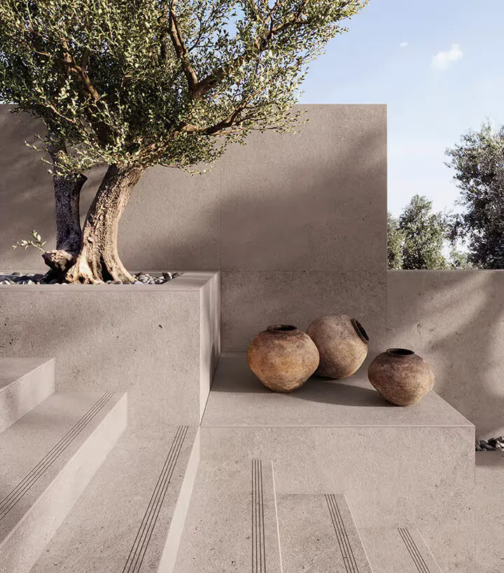 #01 Ceramic and porcelain tiles are the most suitable man-made materials for outdoor tiles. Porcelain outdoor tiles are especially appropriate as an exterior grade flooring thanks to porcelain’s low porosity. Any rainwater falling on these tiles simply runs off without penetrating the surface. Therefore, it avoids the freeze-thaw cycle, which can damage more porous materials. Outdoor porcelain tiles are also very durable, thanks to their density, with a greater resistance to temperature variations over the year.