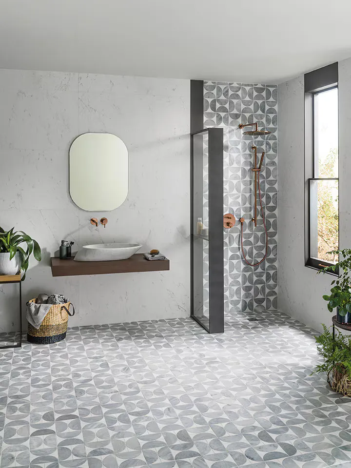 This “more is more” approach helps define different zones within the bathroom. Soften the effect by keeping to a single geometric motif or perhaps two maximum.