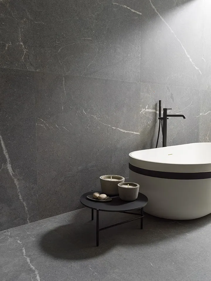 A popular trend in tiles that looks like it’s going to be around for a long time to come is using floor tiles on walls. This is also connected to a trend in featuring larger format tiles. We call anything over 60 cm x 60 cm, large format.
