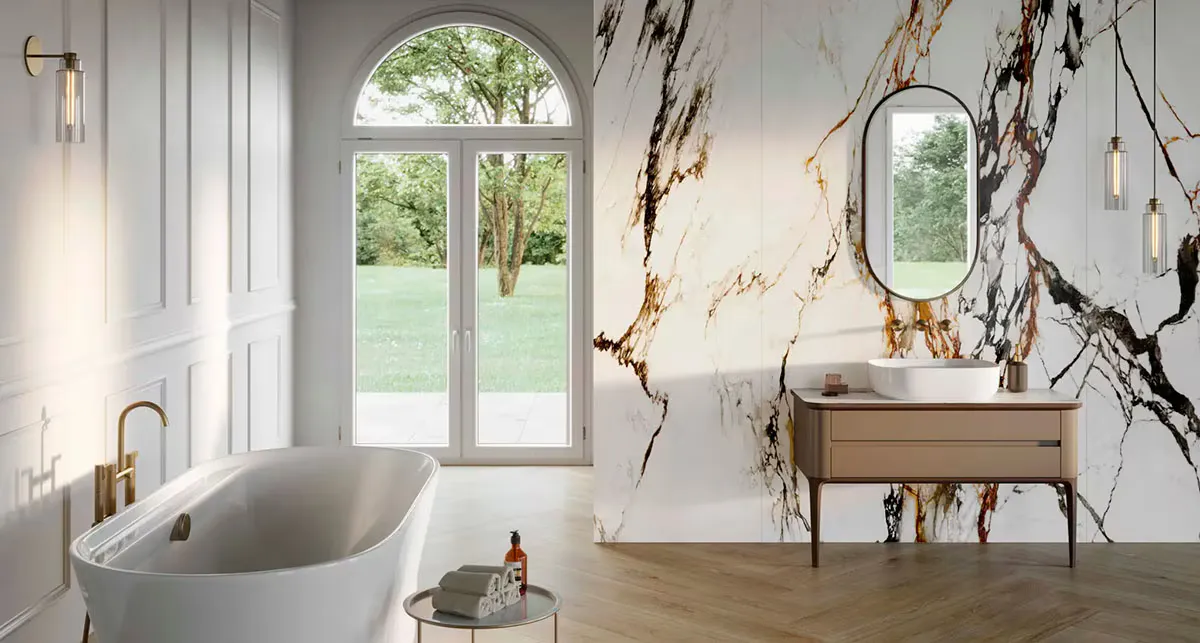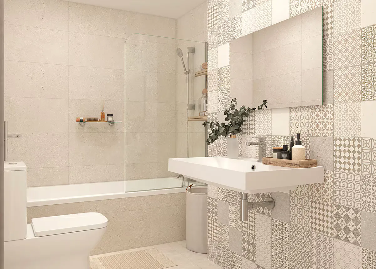 The location of the feature wall in bathroom design is as important as the choice of material. Every bathroom layout is slightly different, depending on space, natural light, ceiling height etc. A feature wall in the bathroom can be created in several locations, depending on the layout. It can occupy a part of a wall or the entire wall. Some popular bathroom feature wall options include the following.