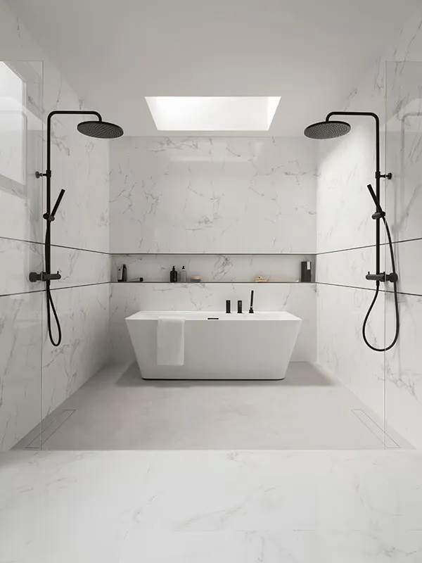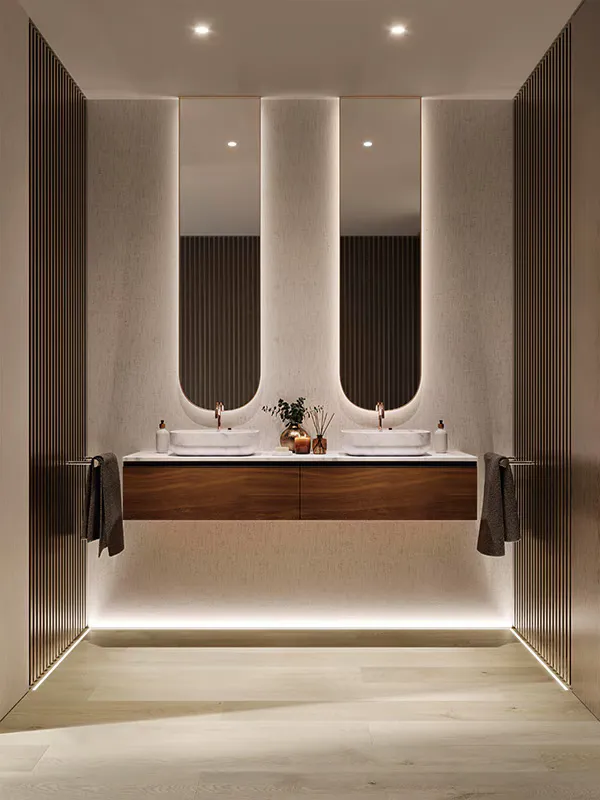 A walk-in shower (with rainfall effect), a home spa, and a double Wash Hand Basin installation can all be treated as a feature wall. This is even more pronounced if the entire width of the space is occupied. Or in the case of the spa an integrated timber wall panel that includes an access door.