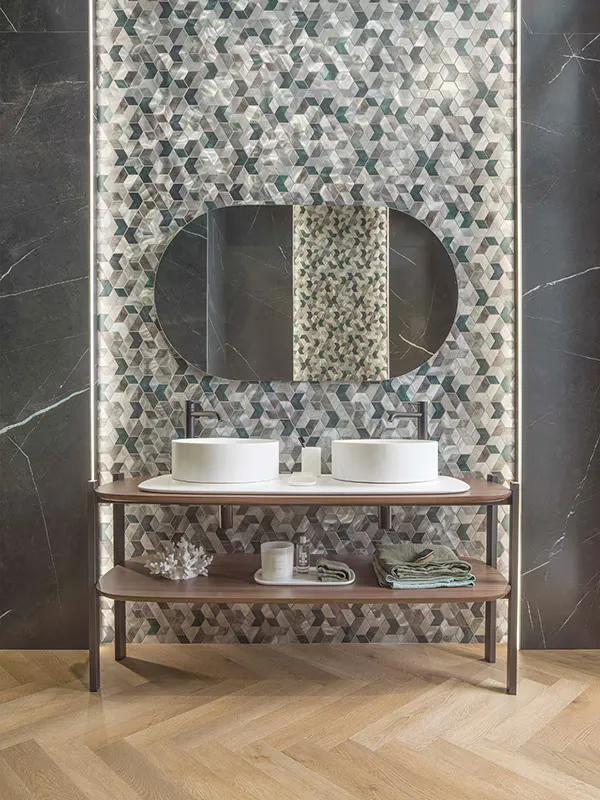 The mosaic bathroom feature wall introduces art into the room through a mural. Not figurative artwork, but abstract art that is created through geometric tiles or other smaller elements that provide an overall coherent custom piece. Tile mosaics are recommended for their easy maintenance and hard-wearing qualities.