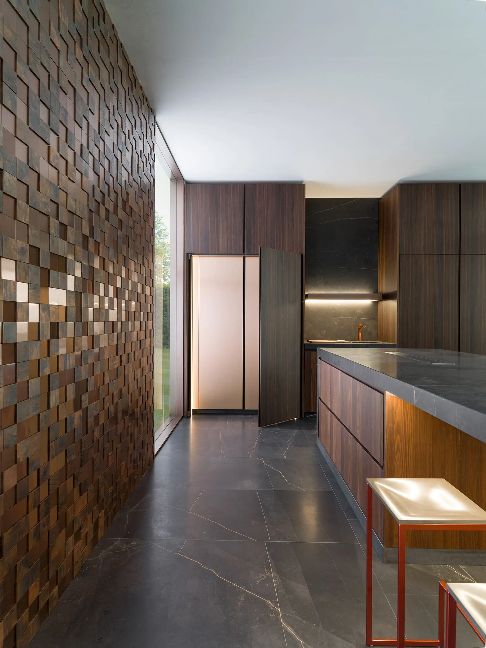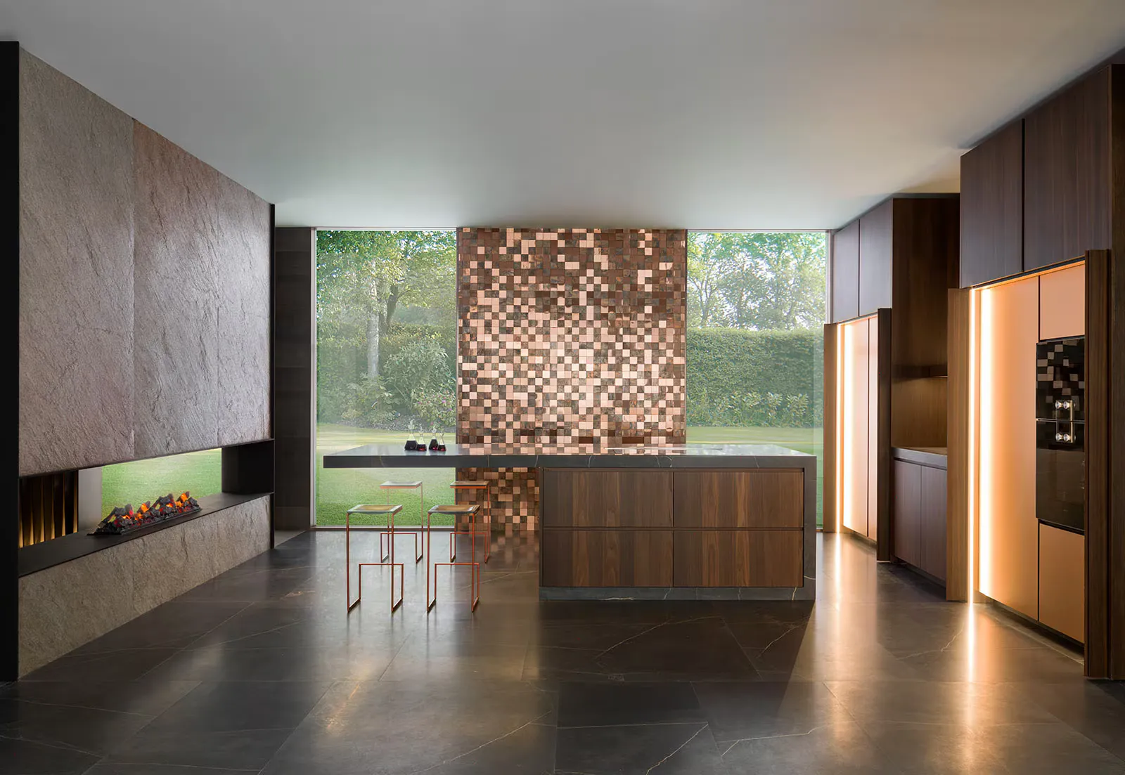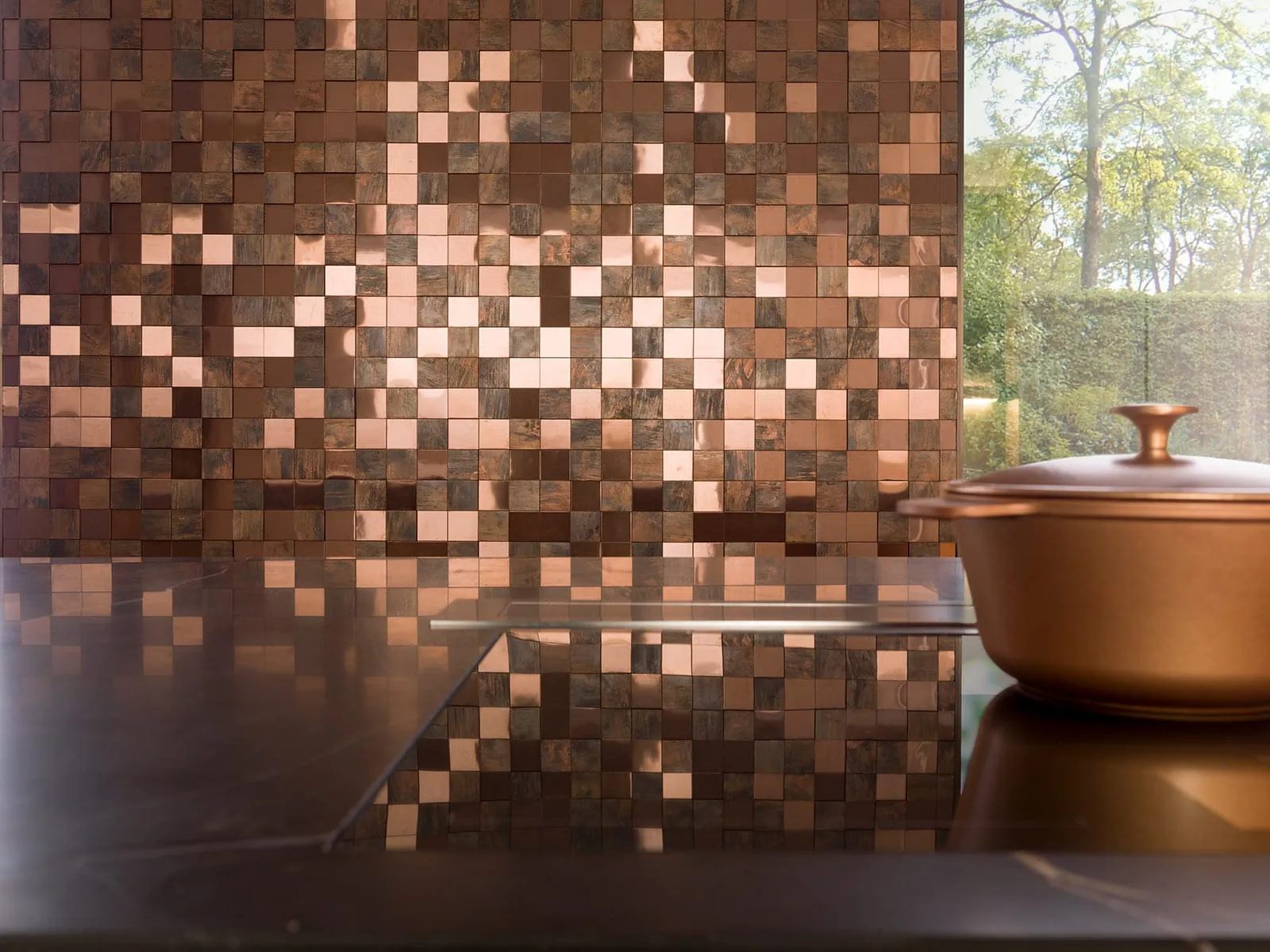 For making a statement without overdoing it use the copper effect tile in small, framed areas. An entire room would be way over the top but a feature wall or panel is just enough to attract attention and create integrated built-in artwork. There are of course numerous alternatives for kitchen backsplash ideas, Porcelanosa offers a wide range of decorative options.