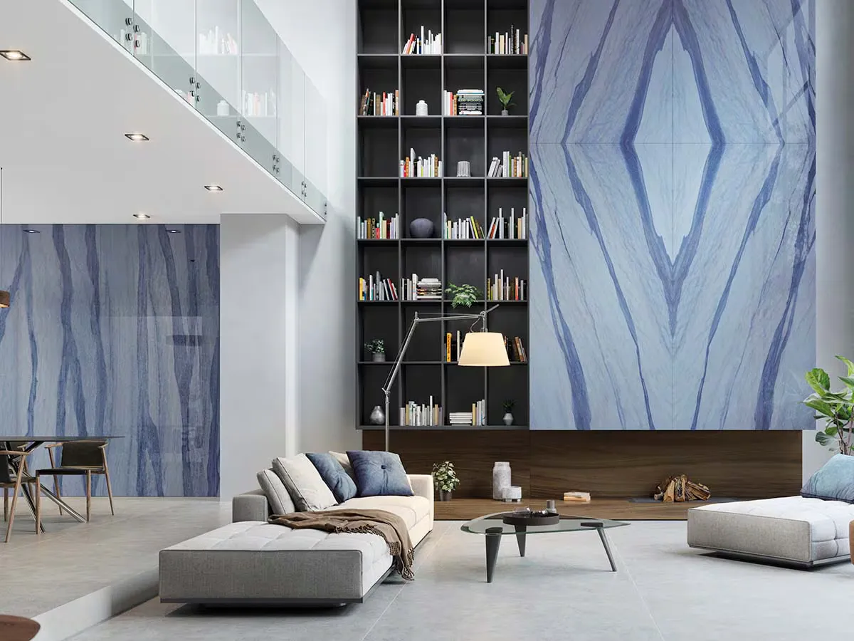 Either stone or porcelain tiles are recommended for cladding fireplace surrounds. Stone is naturally resistant to heat; most varieties are non-combustible and withstand high temperatures. Granite and quartzite are the among the most resilient while marble is prone to thermal shock. Porcelain on the other hand is fired at very high temperatures and is suitable for use in close proximity to heat producing appliances. Marble effect tiles are therefore preferable.