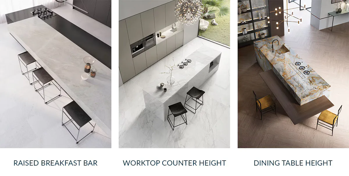 - Breakfast bar raised over the worktop: max. 110 cm height (42 inches) off the ground.