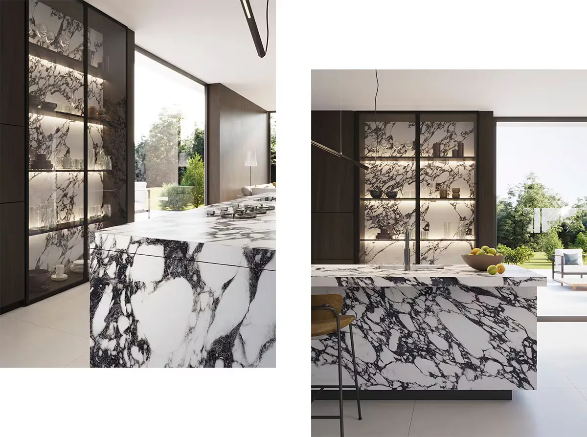 - Add waterfall edges, in other words, the two exposed ends of the kitchen island should feature the same marble cladding as the worktop.