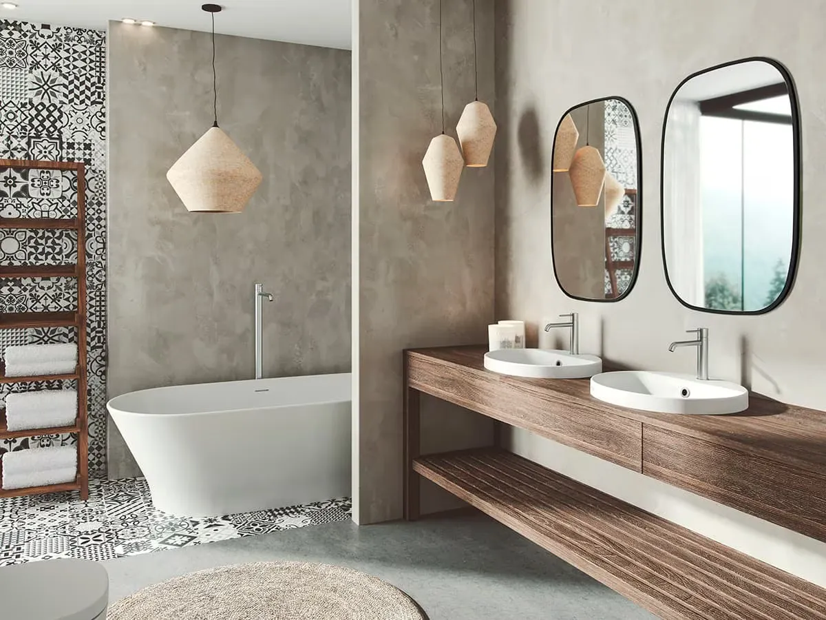 Patterned tiles can be used to reflect the bathroom zoning. Incorporate small and medium tiles with a mosaic effect to create a feature floor or wall.