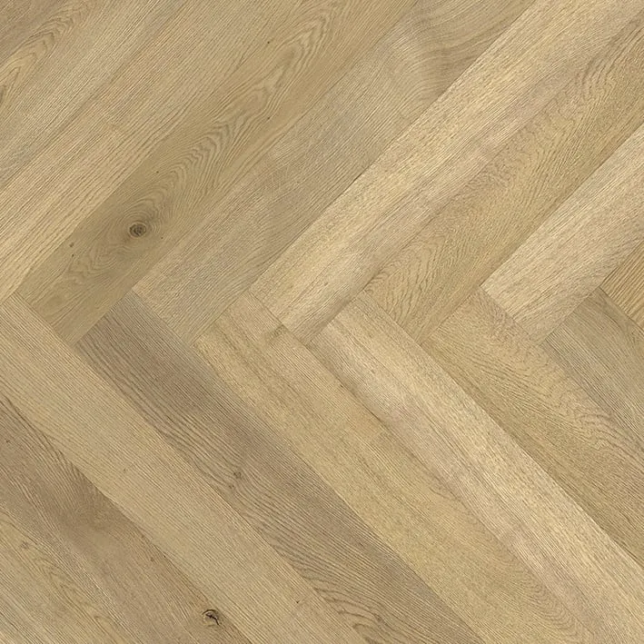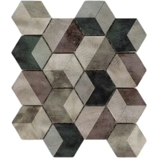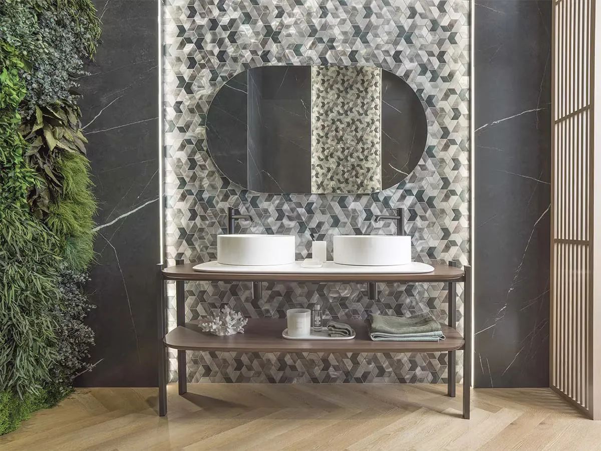 Tile format and size are successfully combined here to create a bathroom with a marked green ambience. The metallic mosaic and the light timber effect vinyl floor tile laid in a herringbone pattern, complement one another perfectly despite being so different. This is achieved by the large format stone effect wall tile framing the mosaic panel. Colour harmony is achieved between the beige floor, the dark grey and the green tones of the mosaic.