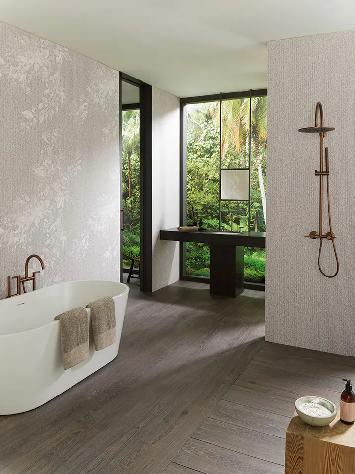 Matching texture with texture is another subtle but powerful approach to bathroom tiling. In this scheme, the abundant glass and natural light create constantly changing lighting effects. The wall tiles and the floor tiles exude organic textures: white and reflective on the walls in a rippled motif; warm and practical from the flooring with its timber effect grain.