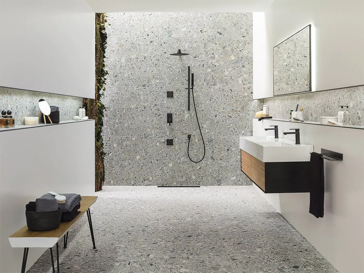 This combination of a full-height panel of matching wall and floor tile helps this bathroom takes on a designer air. The contrast with the terrazzo wall tile on the remainder of the bathroom walls, in white, highlights the stone effect. The secret to this minimalist bathroom is the natural light combined with natural materials. Together with the stratified artefacts that mimic the wall tile, there is a sense of overall order within the layout.