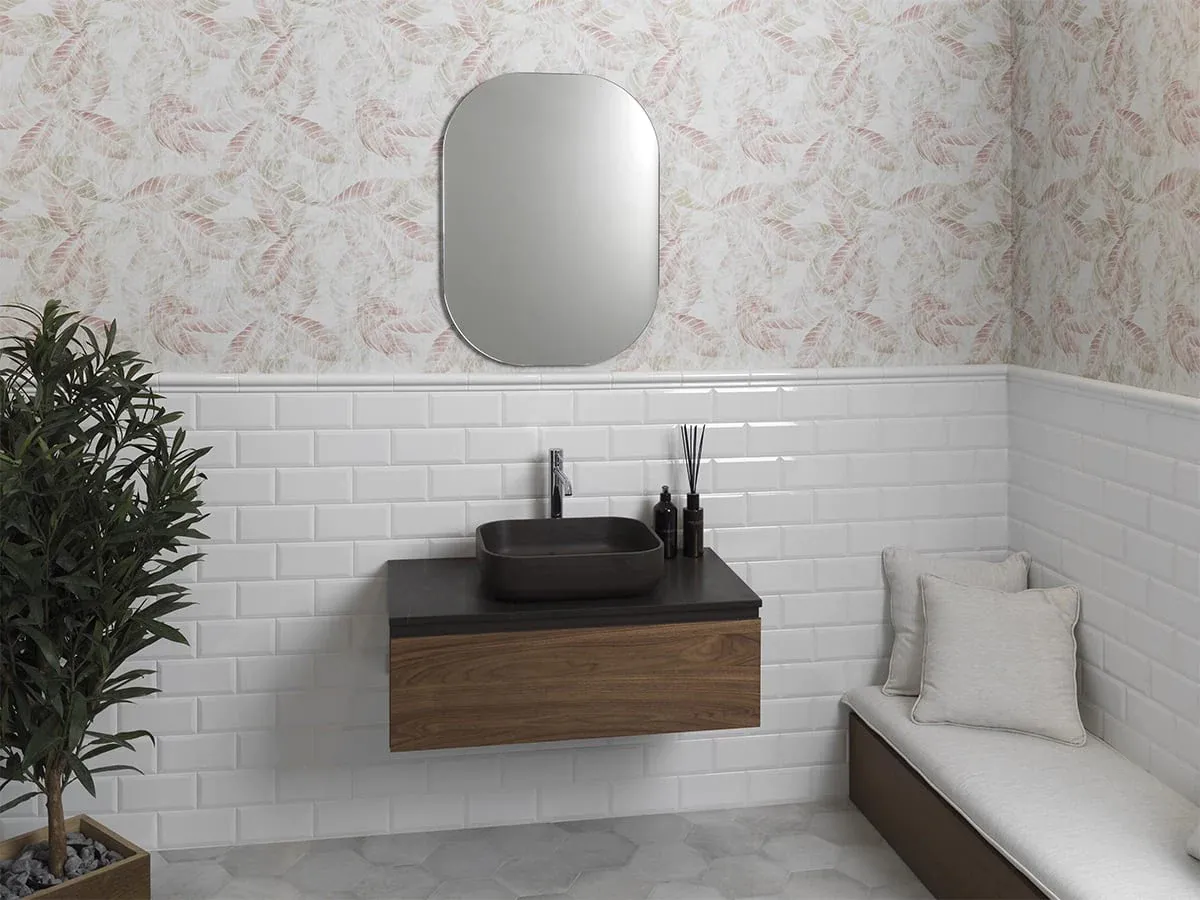 The classic metro tile is combined with an abstract floral pattern wallpaper. The dado profile rail marks the junction between both. Here gloss and matt are beautifully contrasted; wallpaper adds a splash of colour, whereas the metro tiles provide all of the advantges of ceramic, such as durability, low water absorption, and low maintenance. The bathroom fittings, in wood, reflect this classic vintage aesthetic that is modern yet also timeless.