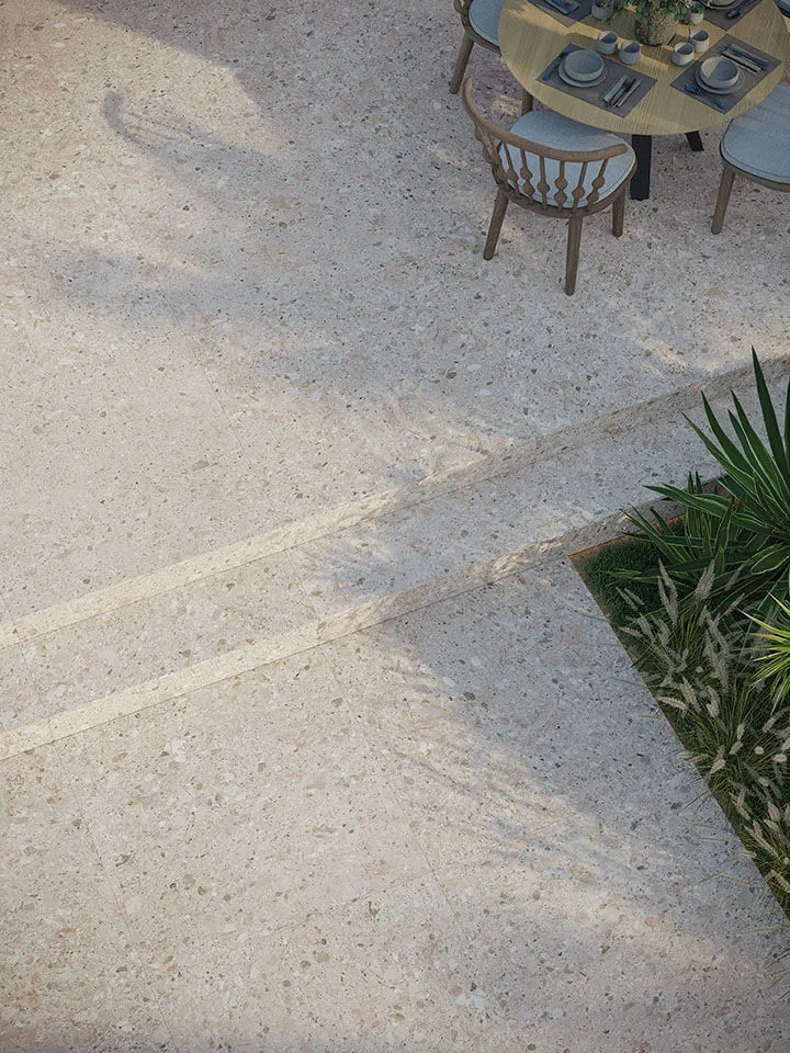 ▶Note: Porcelain is compatible with RAF or raised access flooring for patio areas. This system resembles timber decking where the tiles are supported off the ground on a pedestal system. The pedestals are adapted individually to ensure a level finish, while rainwater runs off below. This further allows utilities to be camouflaged beneath.
