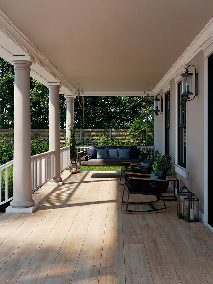- Porcelain is the most suitable material for demanding flooring solutions like the front porch. It’s almost indestructible. And most importantly, its maintenance is minimal.