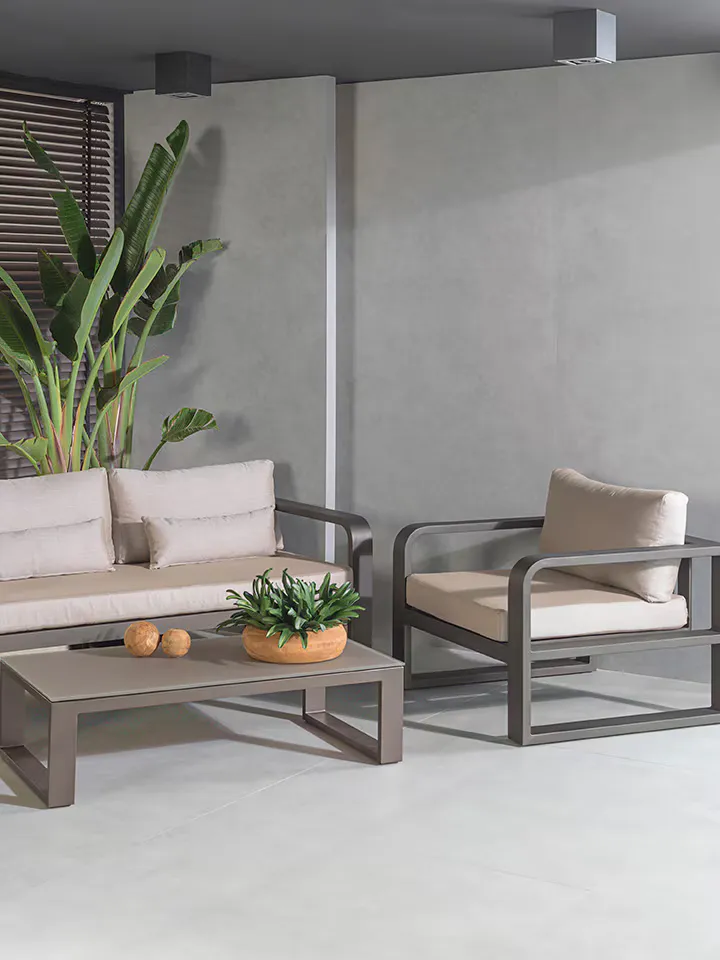 Seating transforms the porch and creates a space which can be enjoyed all year round. The grey porch tile colour scheme lends a modern aesthetic.