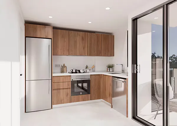 Continuous kitchen flooring helps open up the space visually and makes it appear larger than it is. Rectified tiles help achieve a seamless effect. Vinyl flooring also works.