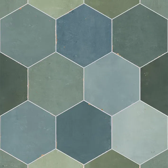 These pastel floor tiles feature different colours within the same area of the colour chart to create a mosaic effect flooring pattern. Up to six tonal variations add visual interest to the floor without overpowering the space. The khaki sandy tones or the aquamarine and turquoise mixture are great for combining with bathroom artefacts.