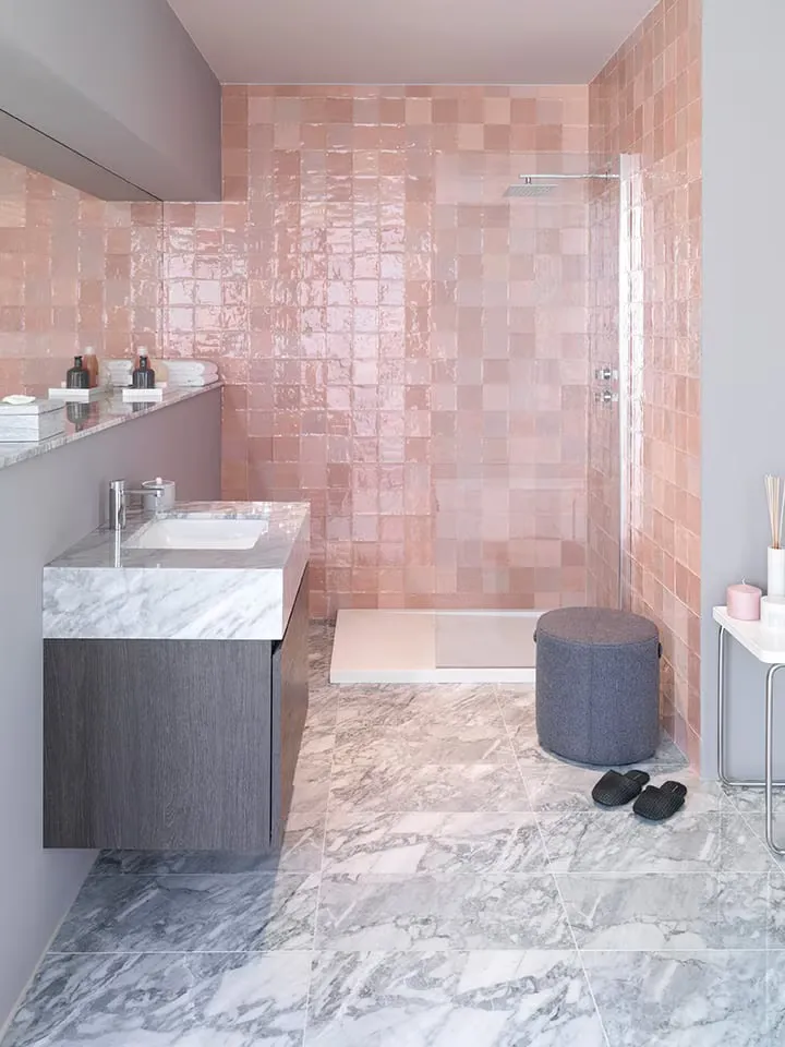 This pastel pink and peach wall tile’s gloss finish and hand-made quality create both texture and subtle colour variations. The square pastel tiles are simply laid to cover an entire feature wall forming a shower cubicle. The mirror creates an illusion of more tiles than there actually are. The gloss finish and simplicity of the pattern make an eye-catching space.
