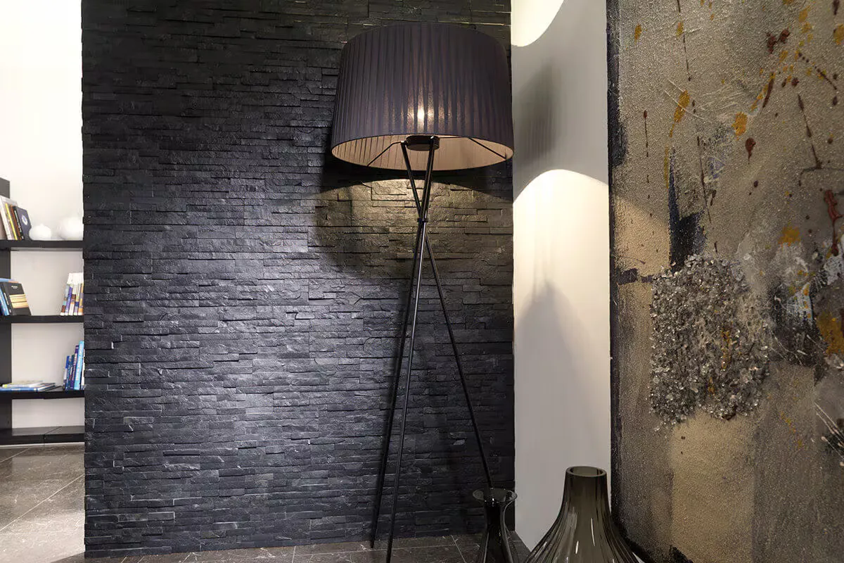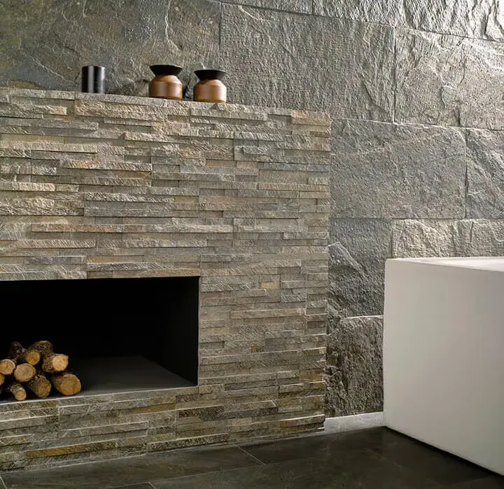 The secret to getting the most from split face wall tiles is the combination of materials. In other words, the background or adjacent wall and floor finishes that frame these tiles. The pairing options for split face slate tiles include the following: