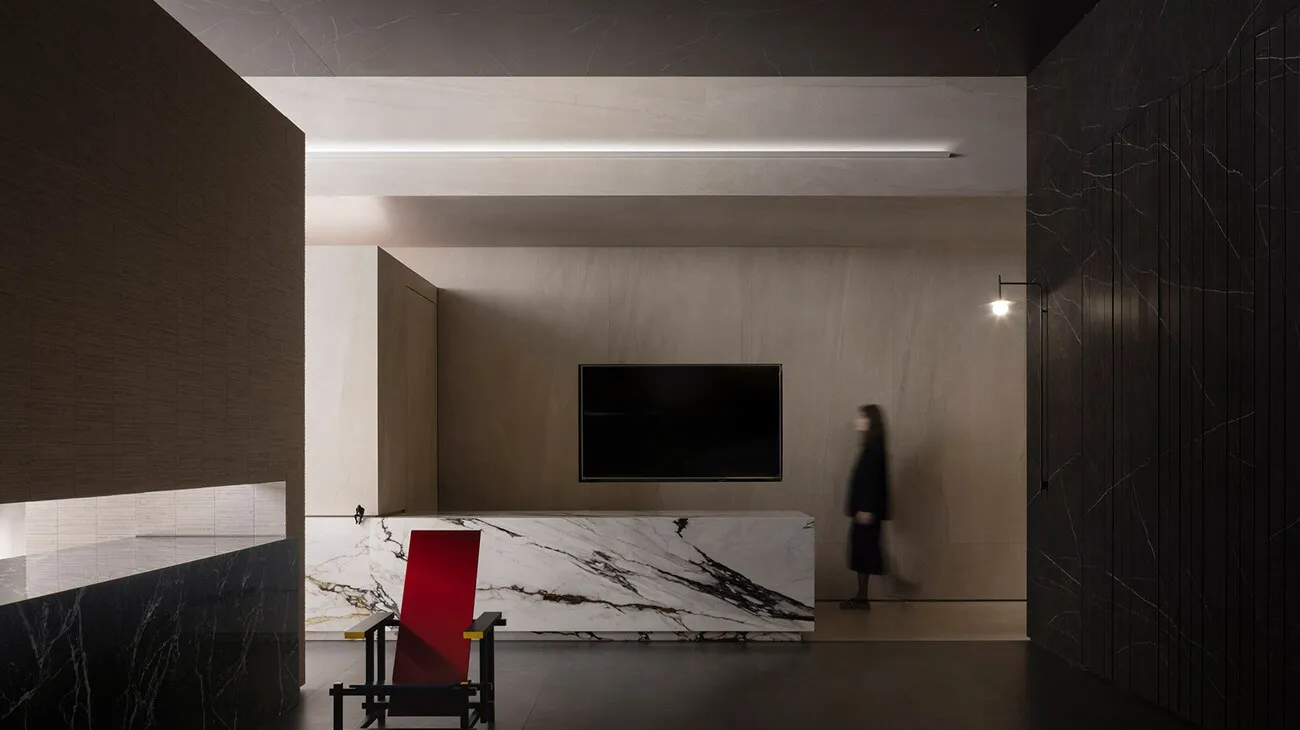 This amazing space, designed by the Chinese studio ZHJS Design, whose international brand is Freely Build, has been developed in collaboration with the local developer Wode. Liu Xiao, head of the studio, explains that this project was born with a very clear objective to offer “To boldly adopt a combination of minimalist and modern styles, respecting the philosophy that PORCELANOSA Group applies in all its projects.”