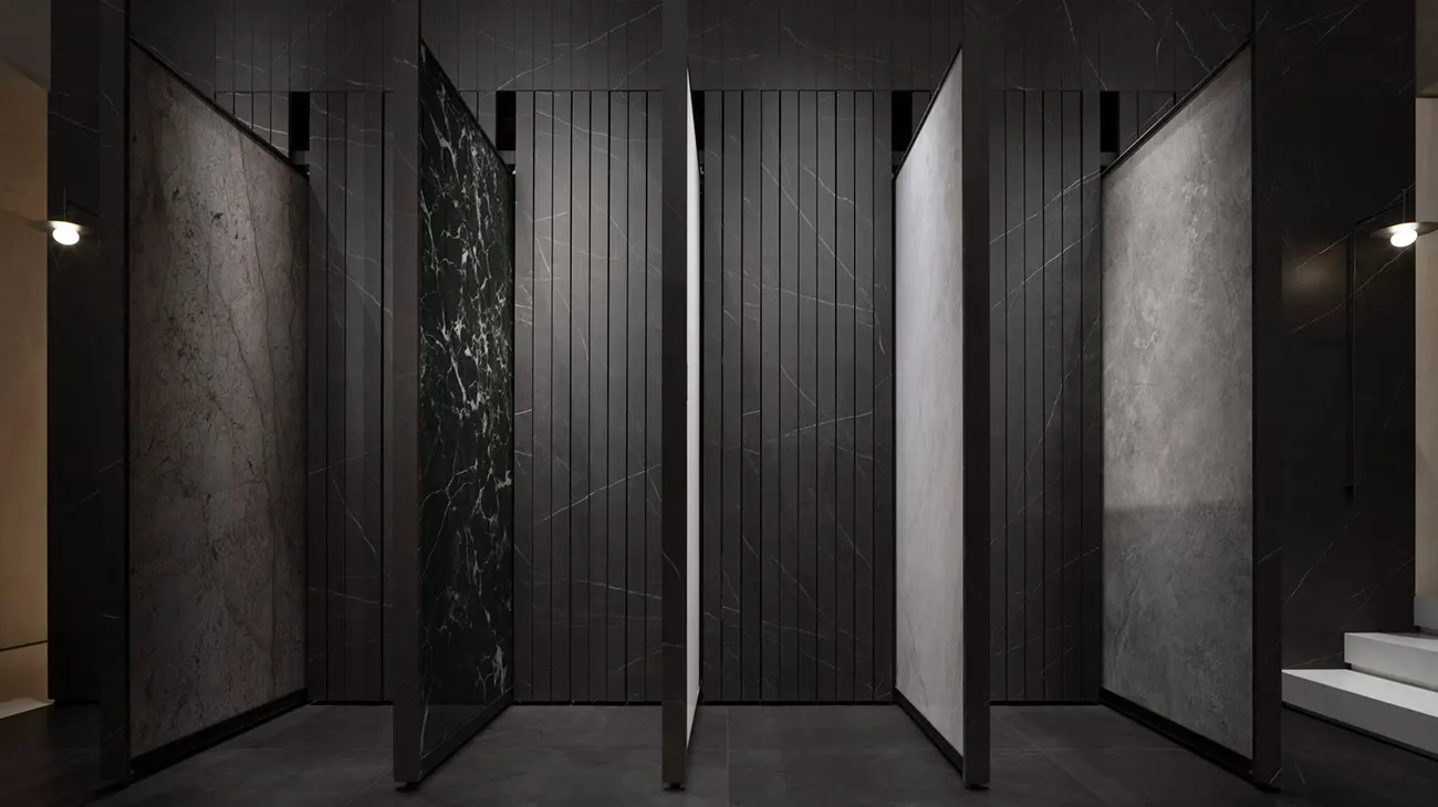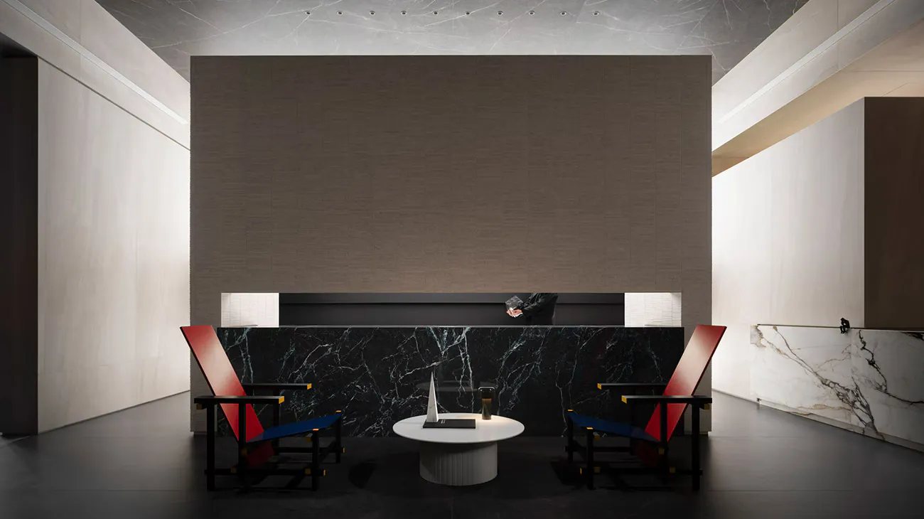 Porcelanosa Group’s new space in Guangzhou is the first showroom to employ smart interactive displays with sintered mineral pieces. For Liu Xiao, “Everything has been thoroughly studied and researched, and every detail is related to how the technology applied this material is displayed: a sliding cabinet, the entrance to an office, the air conditioning outlet…”. Technology at the service of aesthetics “that adheres to the concept of a return to nature, allowing visitors to travel back to the original landscape, as the materials present the purest side of nature, with colors that bring people back to that environment.”