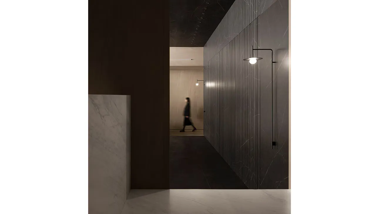 The entrance is defined by a mirror that visually extends the floor to infinity and by a suspended wall that creates open spaces that encourage curiosity. This layout facilitates the flow of people and enhances their perception compared to larger surface area models. “PORCELANOSA Group has a wide range of products with delicate textures that provide details and enrich the different areas of a home,” says Liu Xiao.